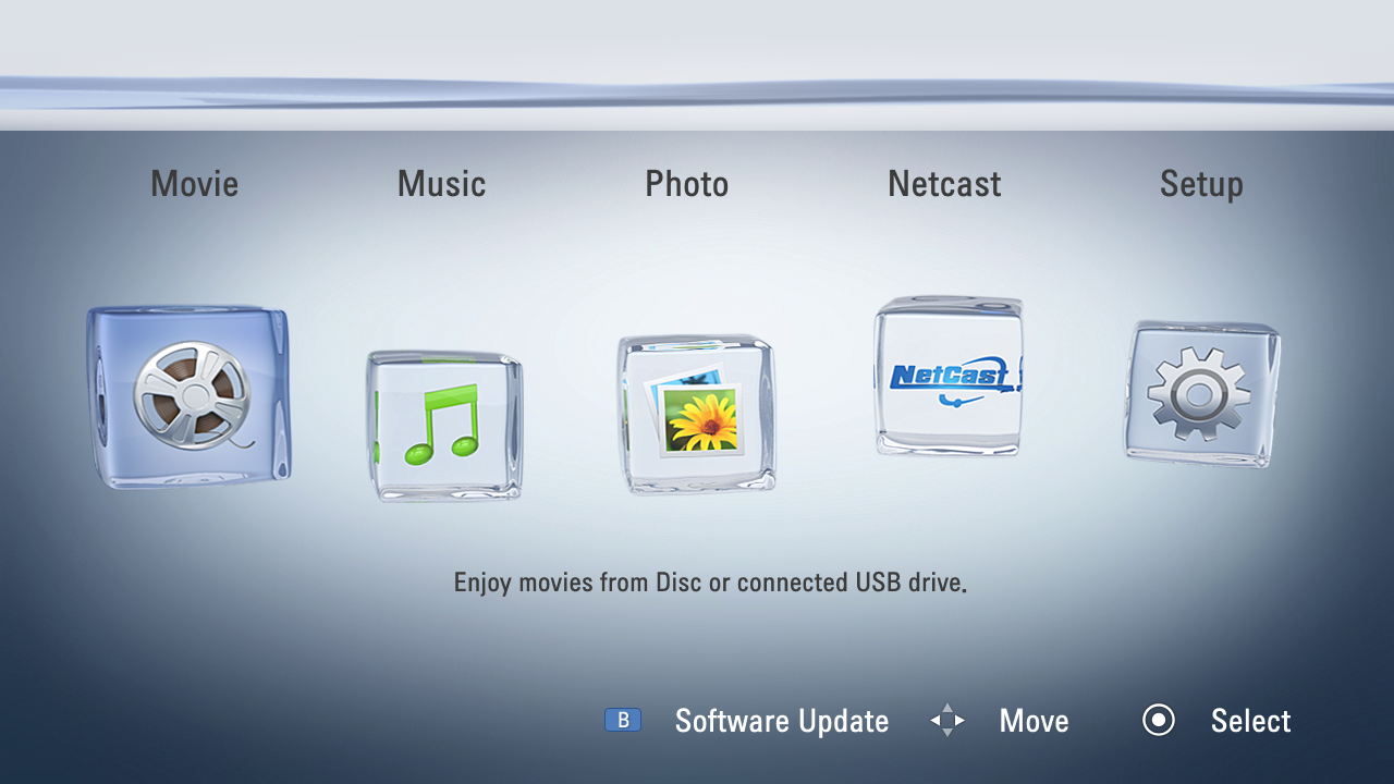 These cubes are displayed on the main menu in 2010 Bluray players / Home theater systems. In this case they represent Ice cubes floating in water. There are actually two versions of this menu. One of them is animated and floating, in high end devices using LG's own OS and Broadcomm cpu. (Like lg hx995tz). The other version is present on devices with MEDIATEK common OS and platform, and is not animated and a little different. This version is shown below: